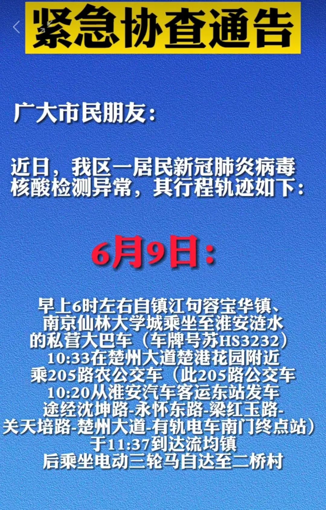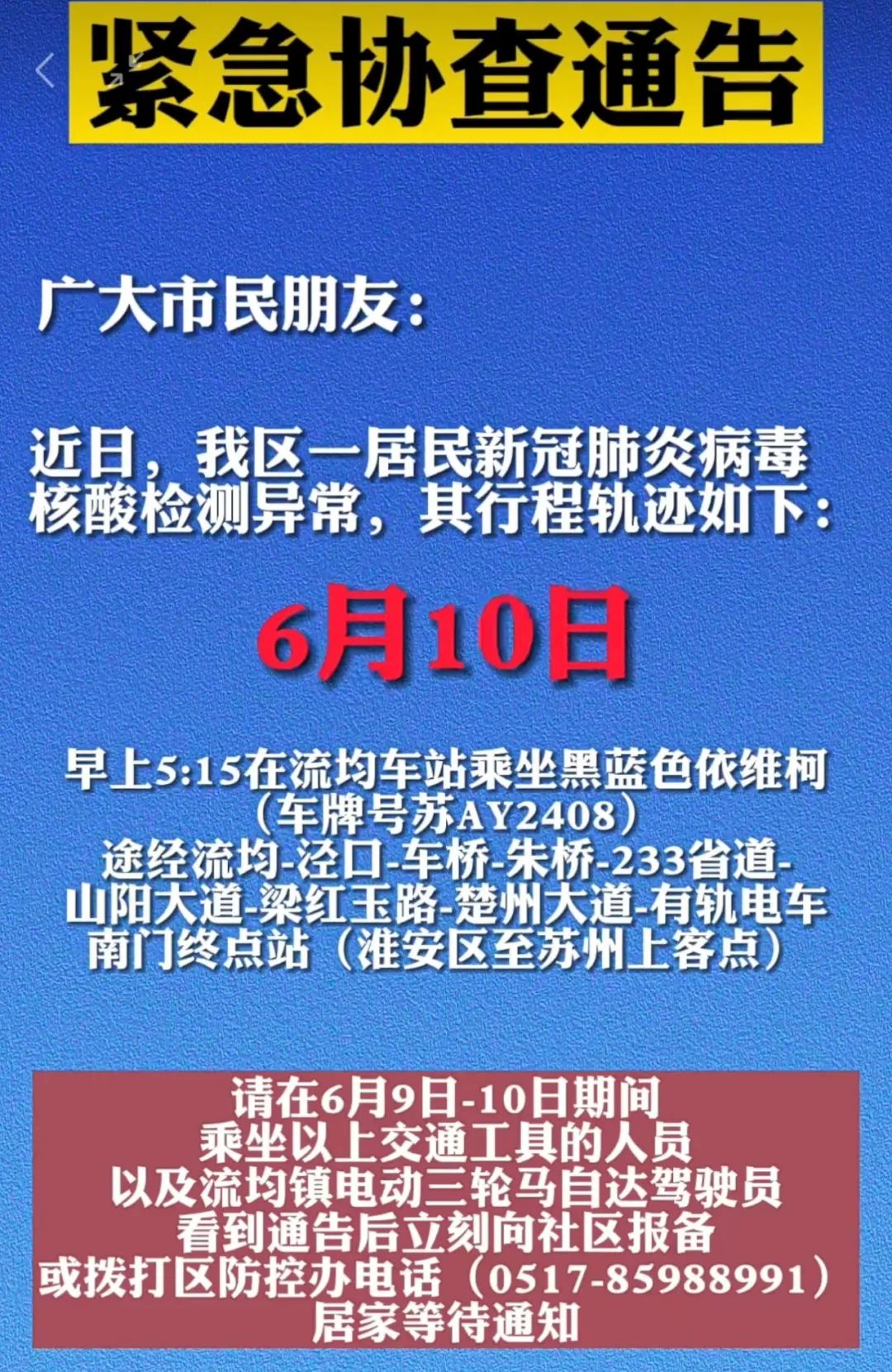 導(dǎo)讀:淮安區(qū)發(fā)布緊急協(xié)查通告,一居民新冠肺炎病毒核酸檢測(cè)異常!