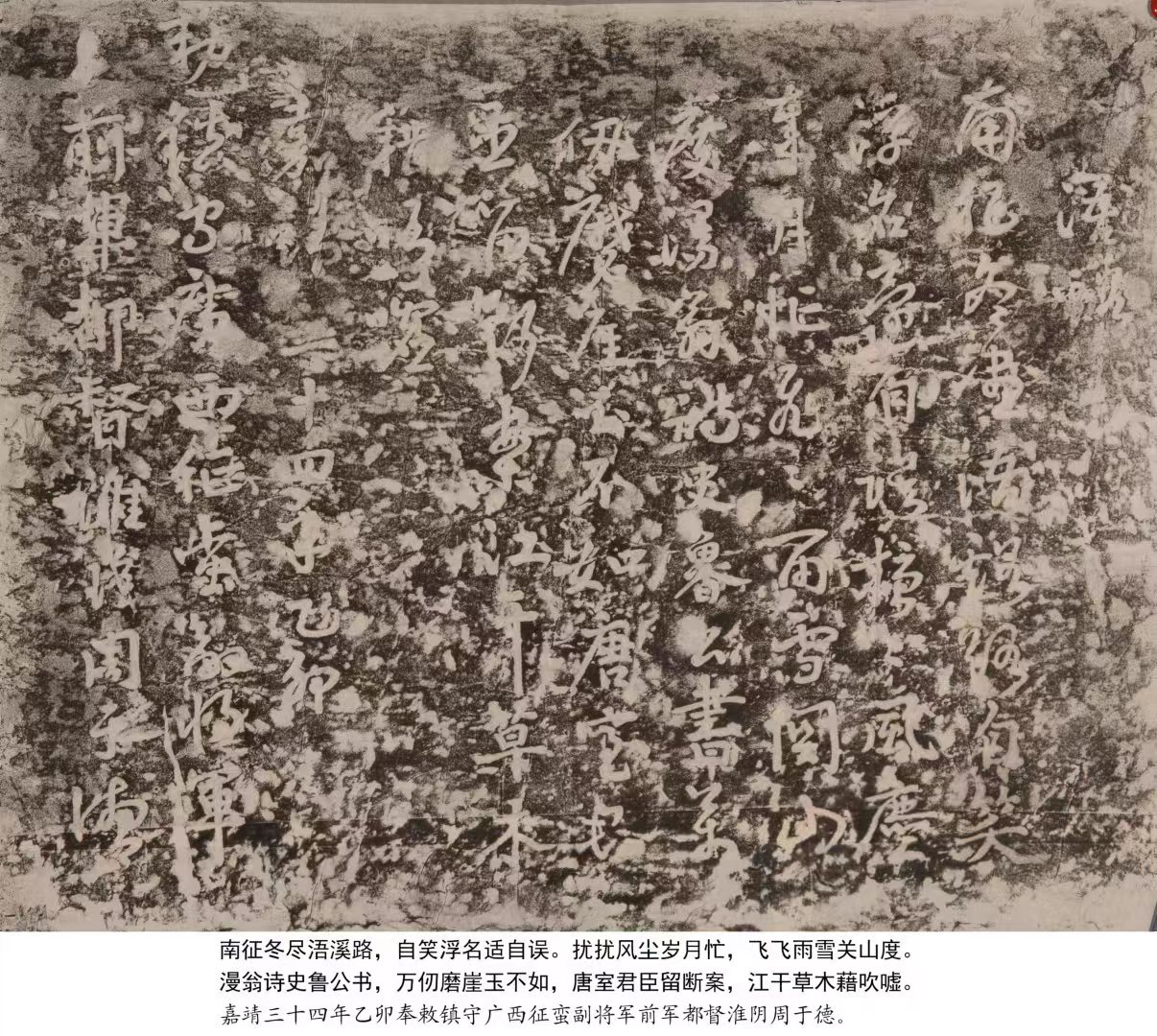 癸卯年新春,筆者二人討論明朝淮安籍狀元丁士美的詩(shī)作。在查閱清朝吳玉搢輯《山陽(yáng)耆舊詩(shī)》時(shí),發(fā)現(xiàn)丁士美詩(shī)作后面是周于德的詩(shī)作。周于德這個(gè)名字引起高求志的注意。因?yàn)楦咔笾驹鴧⑴c編輯家鄉(xiāng)湖南祁陽(yáng)的《浯溪摩崖石刻》一書(shū),其中收有“淮陰將軍周于德”的詩(shī)碑拓片一張。原來(lái),丁士美、周于德都是明朝淮陰人,而且年齡相仿。這引起了二人考證周于德的興趣。