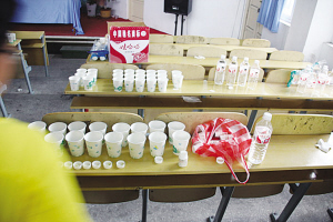 階梯教室的桌子上擺滿了裝有飲用水的一次性杯子。