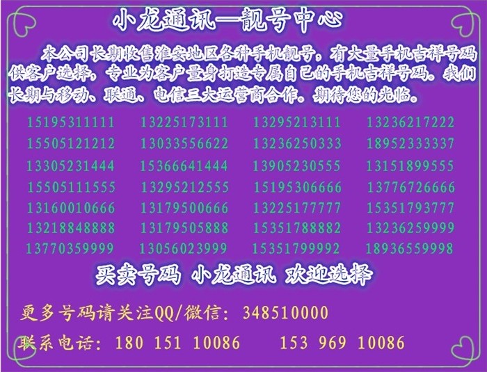 淮安市小龍通訊號(hào)碼中心-淮安手機(jī)靚號(hào)中心,為客戶提供大量手機(jī)靚號(hào),吉祥號(hào)碼,手機(jī)吉祥號(hào)碼,為客戶提供廣泛的靚號(hào)選擇空間。信譽(yù)高,服務(wù)最好,效率最快,公司與移動(dòng),聯(lián)通,電信三大運(yùn)營(yíng)商合作,為客戶提供總價(jià)值過(guò)千萬(wàn)的手機(jī)號(hào)碼資源,小龍手機(jī)靚號(hào)中心是淮安第一手機(jī)靚號(hào)中心。