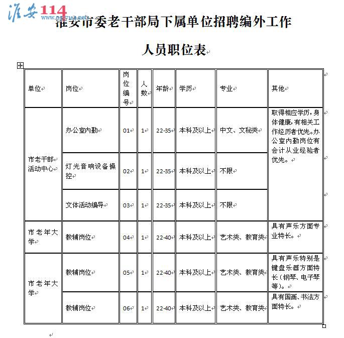 (三)符合崗位要求的其他條件(附件1:淮安市委老干部局下屬單位招聘編外工作人員職位表)。