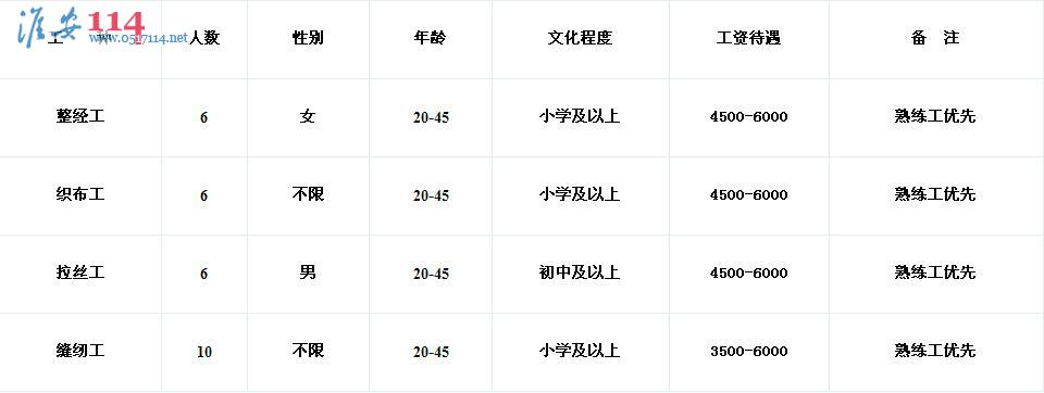 淮安百姓網(wǎng)關(guān)鍵詞:江蘇新金菱集團(tuán),金湖招聘整經(jīng)工,金湖縫紉工,金湖拉絲工,金湖織布工,金湖電線(xiàn)電纜