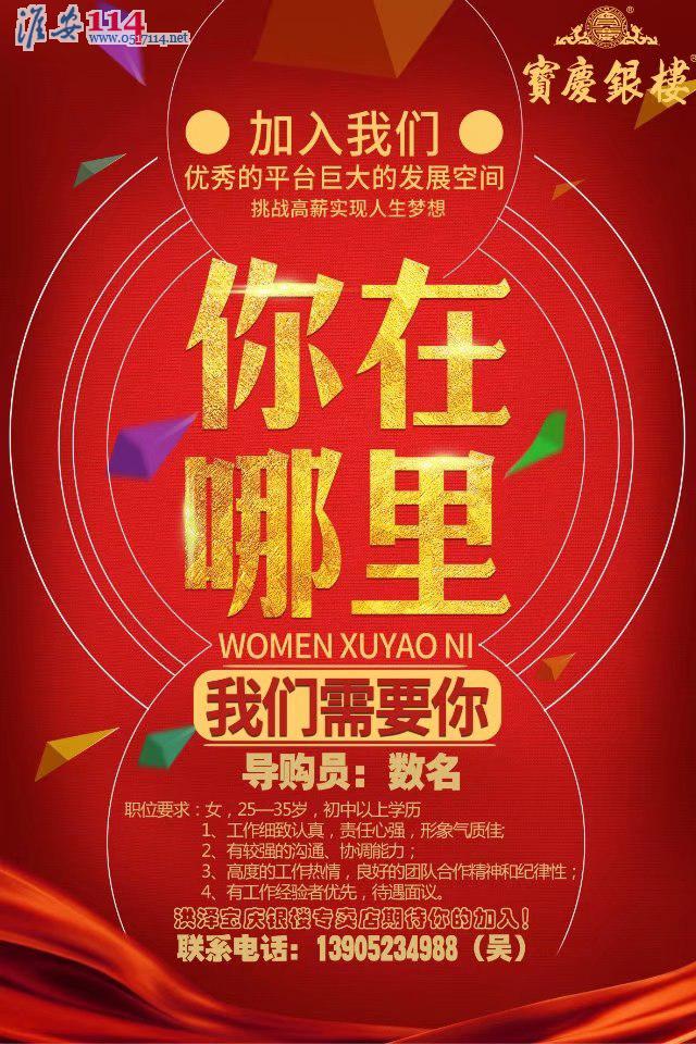 洪澤寶慶銀樓專賣店招聘營業(yè)員導(dǎo)購若干名,待遇面議。