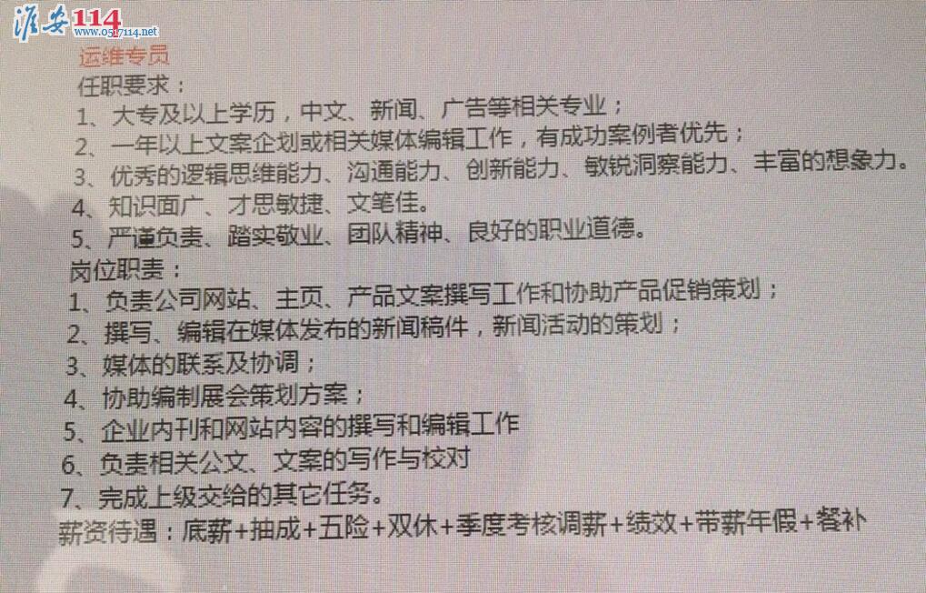 洪澤區(qū)網(wǎng)庫信息技術(shù)有限公司招聘運營專員4名,性別不限,學(xué)歷不限,工資待遇面議,有意者請電話聯(lián)系,詳情見下圖!