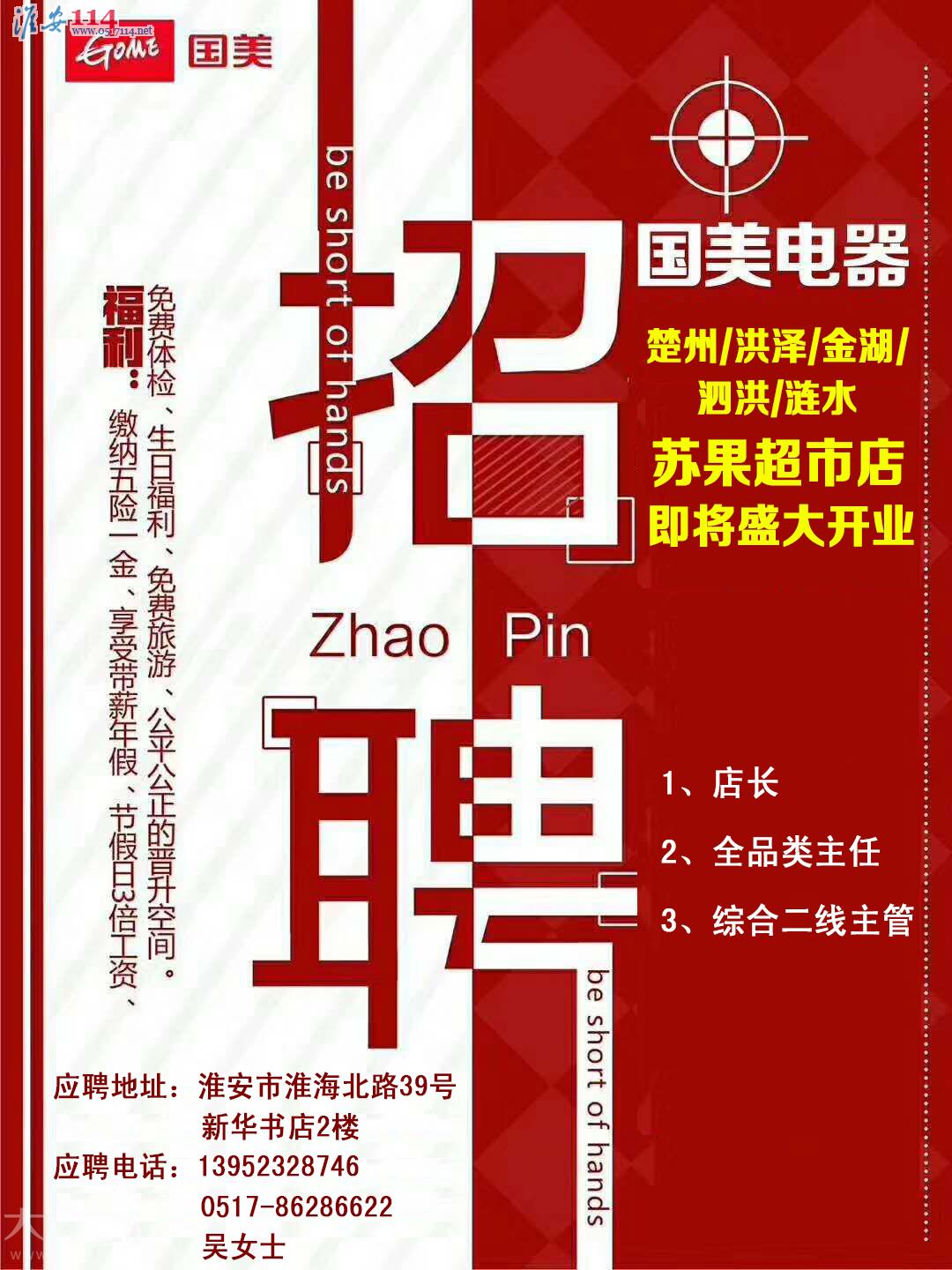 淮安百姓網(wǎng)關(guān)鍵詞:國美電器洪澤蘇果超市店招聘人才