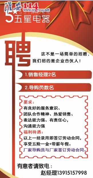 淮安百姓網(wǎng)關(guān)鍵詞:五星電器招聘銷售經(jīng)理,繳納五險(xiǎn)一金