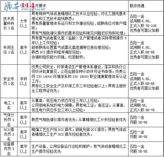 淮安百姓網(wǎng)關(guān)鍵詞:金宏氣體電子材料(淮安)有限責(zé)任公司招聘質(zhì)量科科長、車間主任、安全專員、操作工、電工、分析員