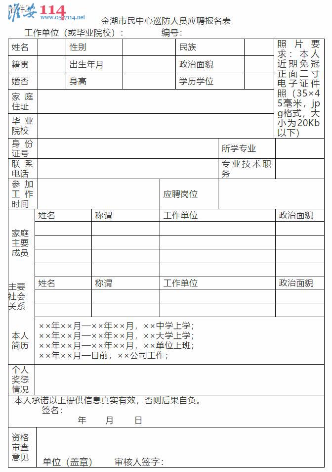 2.金湖市民中心巡防人員應(yīng)聘報(bào)名表;