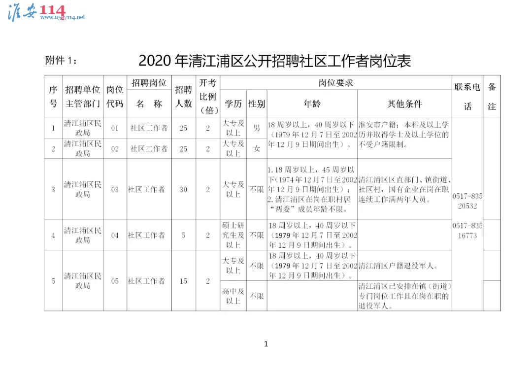 招聘崗位、人數(shù)和相關(guān)要求詳見附件1《2020年清江浦區(qū)公開招聘社區(qū)工作者崗位表》(以下簡稱《崗位表》)。