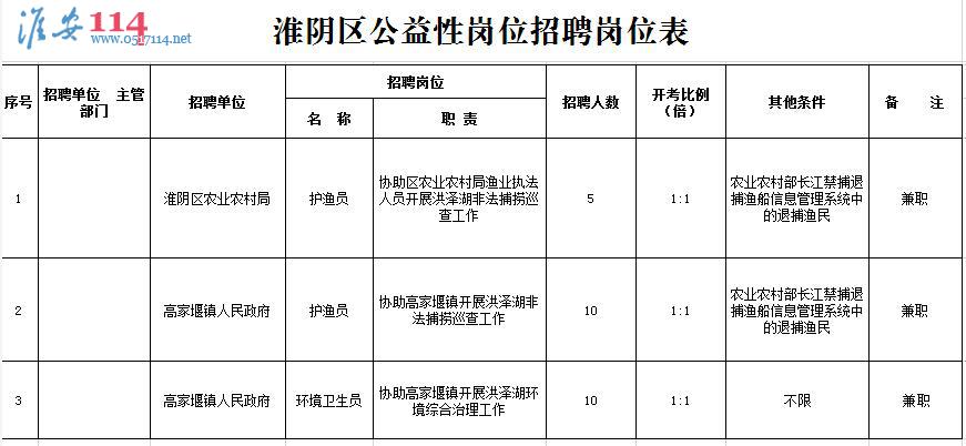 護(hù)漁員15名、環(huán)境衛(wèi)生員10名,詳見《淮陰區(qū)公益性崗位招聘崗位表》(請見附件1,以下簡稱《崗位表》)。
