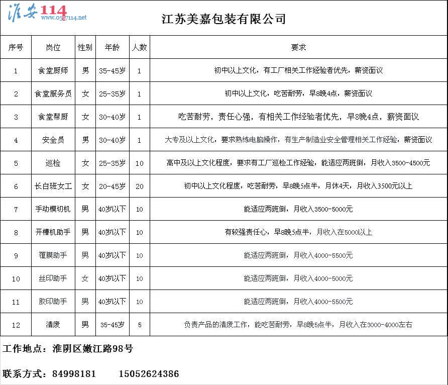 江蘇美嘉包裝有限公司招聘品控部經(jīng)理、技術(shù)副經(jīng)理、生產(chǎn)副經(jīng)理、安全員、女工、巡檢、模切、裝卸相關(guān)圖片信息