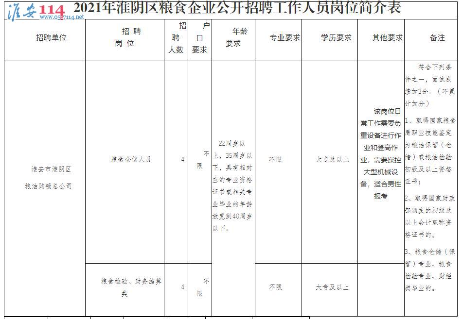 詳見《2021年淮陰區(qū)糧食企業(yè)公開招聘工作人員崗位表簡介表》。