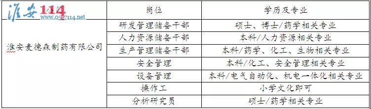淮安百姓網(wǎng)關(guān)鍵詞:淮安麥德森制藥有限公司招聘儲(chǔ)備干部(研發(fā)、人力、生產(chǎn))、安全管理、設(shè)備管理、操作工、分析研究員