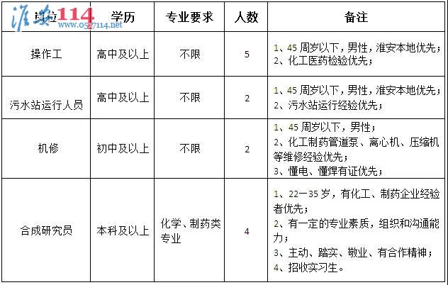 淮安百姓網(wǎng)關(guān)鍵詞:江蘇永安制藥有限公司招聘操作工、污水站運(yùn)行人員、機(jī)修工、合成研究員