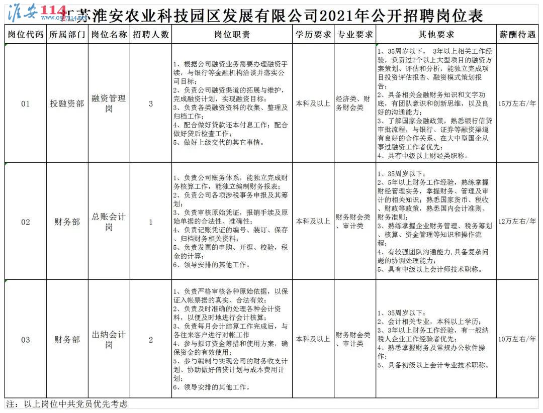 本次招聘名額共6人,具體崗位及要求詳見《江蘇淮安農(nóng)業(yè)科技園區(qū)發(fā)展有限公司2021年公開招聘崗位表》。