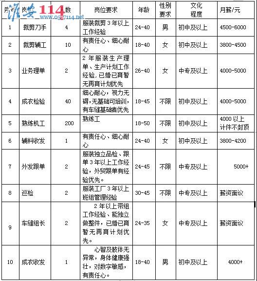 淮安百姓網(wǎng)關(guān)鍵詞:江蘇俊億服飾有限公司招聘裁剪刀手、裁剪輔工、業(yè)務(wù)理單、成衣檢驗(yàn)、熟練機(jī)工、輔料批發(fā)、外發(fā)跟單、巡檢、車(chē)縫組長(zhǎng)、成衣收發(fā)