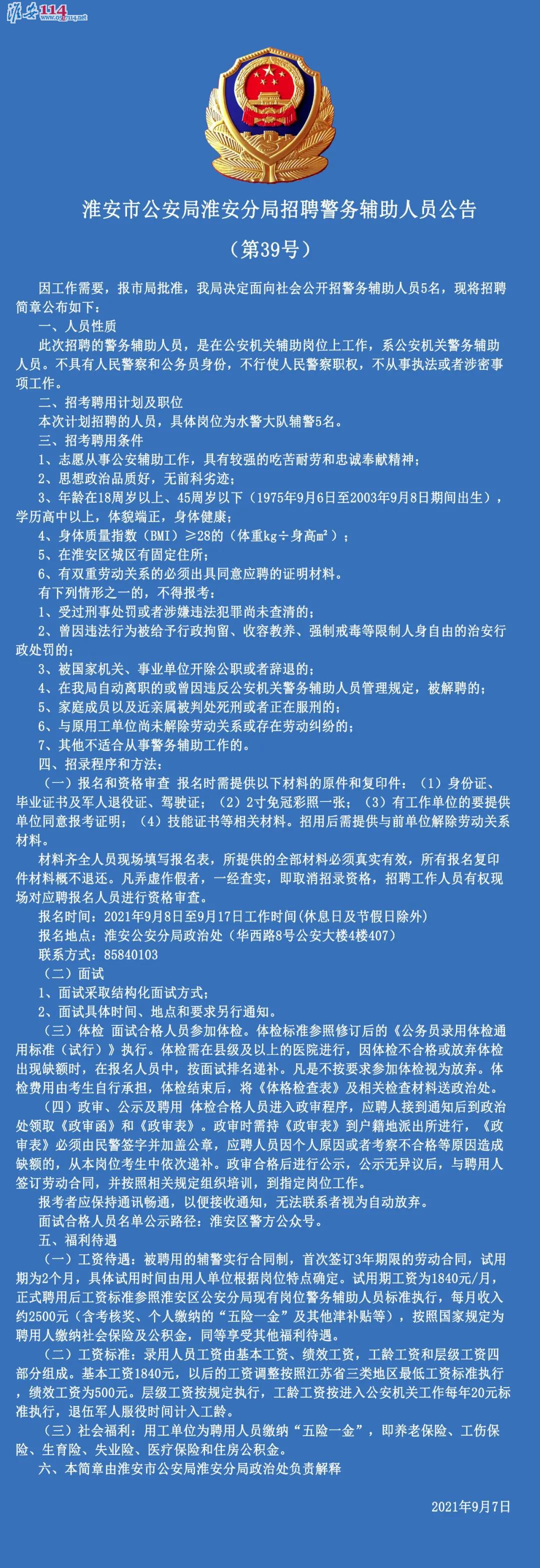 淮安市公安局淮安分局招聘水警大隊警務(wù)輔助崗位人員5名,適合男性,(18-45周歲,高中以上文化)有意者請電話聯(lián)系。