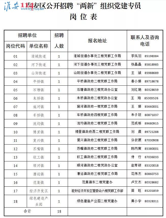 根據(jù)工作需要,淮安區(qū)面向社會公開招聘新經(jīng)濟組織和新社會組織黨建專員18名,現(xiàn)將有關(guān)事項公告如下: