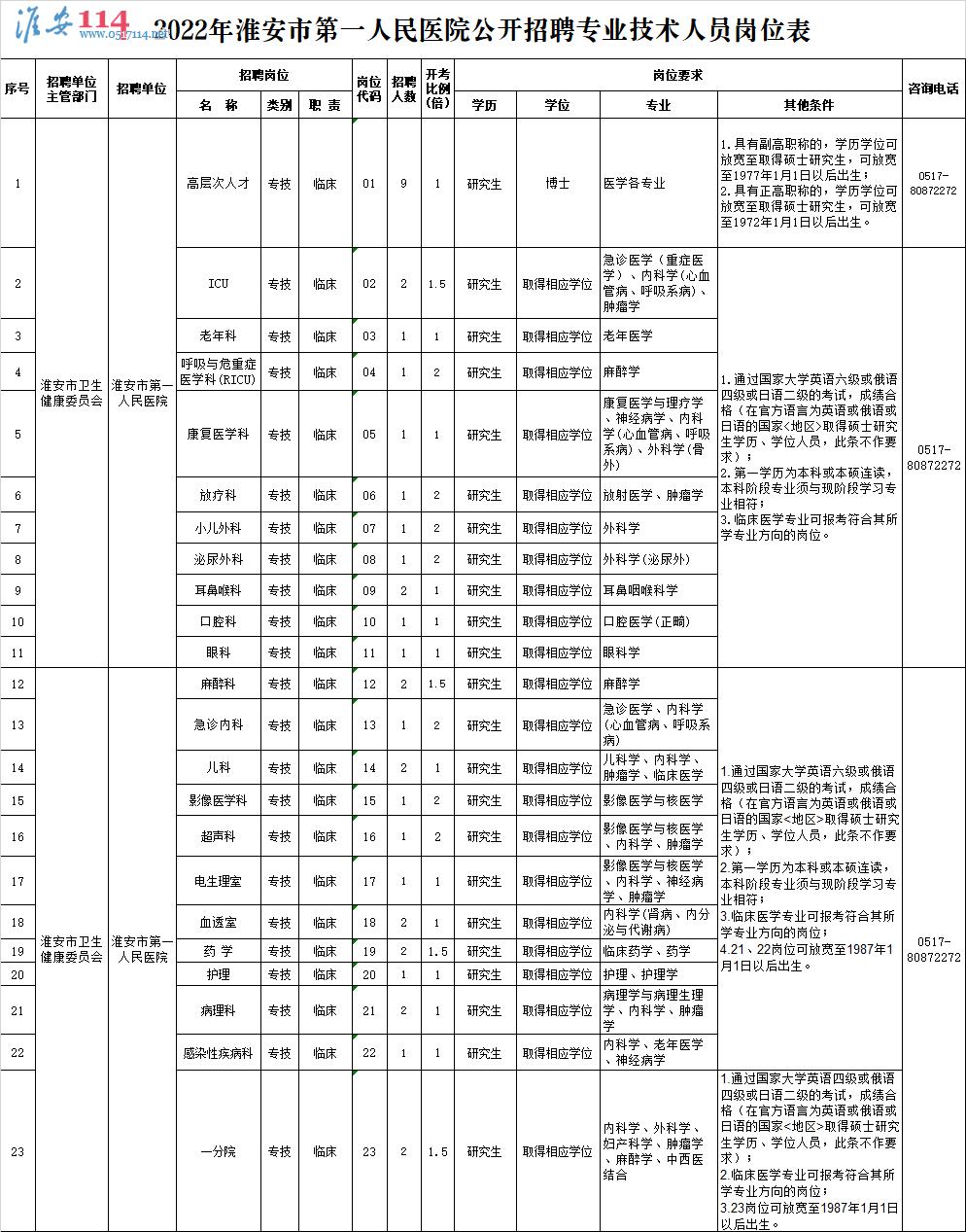 崗位代碼為01的崗位(高層次人才崗位)報(bào)名采取先投檔后確認(rèn)的方式進(jìn)行,應(yīng)聘人員自本公告發(fā)布之日起即可向淮安市第一人民醫(yī)院投遞自薦材料(簡歷投遞郵箱:rsk4923364@163.com),已招滿的崗位不再接受投檔,投檔截止日期為2022年12月31日。報(bào)名咨詢電話:0517-80872272。