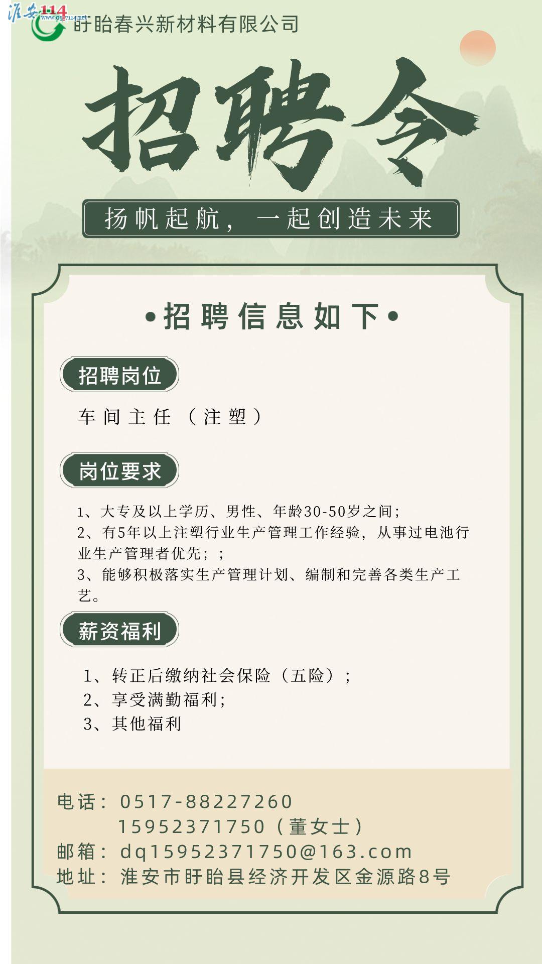 淮安百姓網(wǎng)關(guān)鍵詞:盱眙春興新材料有限公司招聘車間主任(注塑)