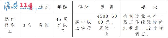 招聘操作工3名,要求男性,年齡45周歲以下,高中以上學歷,月薪4500-6000元,繳納五險一金,有制造業(yè)生產一線工作經驗的優(yōu)先考慮,12小時倒班。