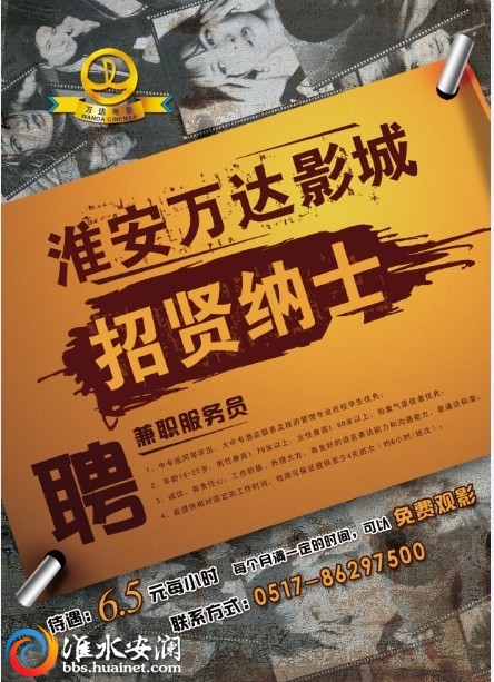 淮安百姓網(wǎng)關(guān)鍵詞:淮安萬(wàn)達(dá)影城誠(chéng)招兼職員工,應(yīng)聘從速!