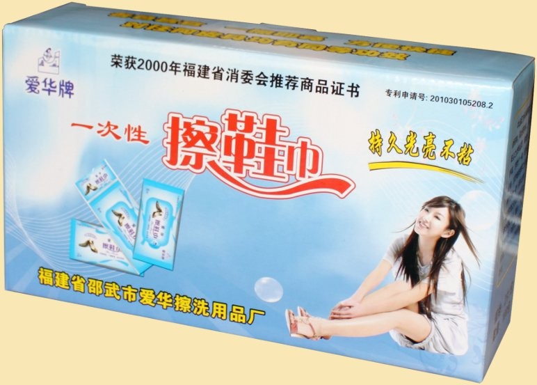 擦鞋巾(也稱擦鞋紙):愛華牌一次性高級擦鞋巾,對皮鞋面上的泥土具有很強的去污功效,無需鞋油鞋刷,對各色皮鞋、皮衣一擦即亮(無需象用鞋油鞋刷那樣反復(fù)擦刷才會亮),而且效果比用鞋油更光亮,光亮更持久,不沾灰塵,并起護革作用,對運動鞋也具有很好的去污功效。產(chǎn)品衛(wèi)生無毒,存放保質(zhì)期為兩年。